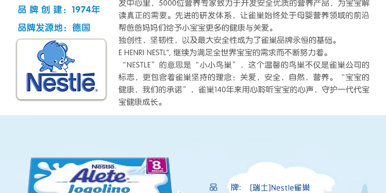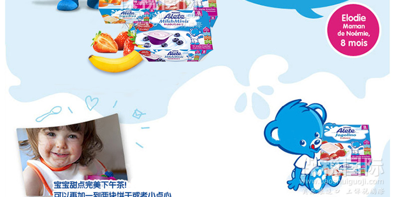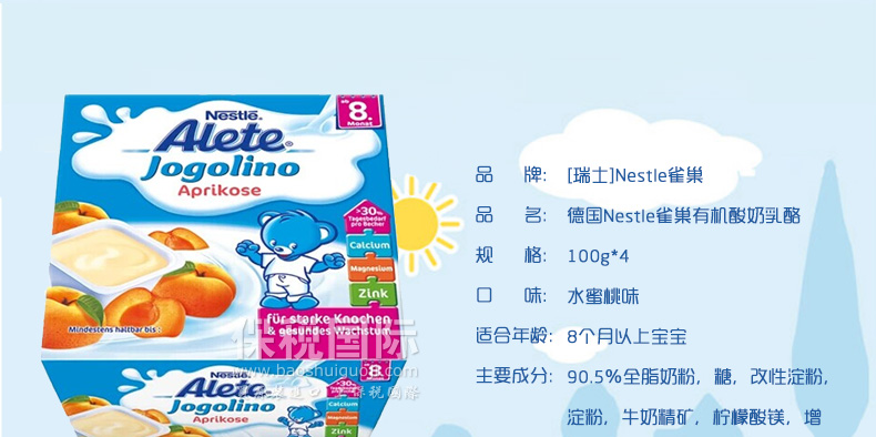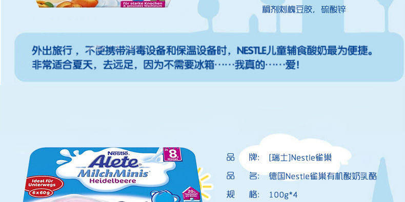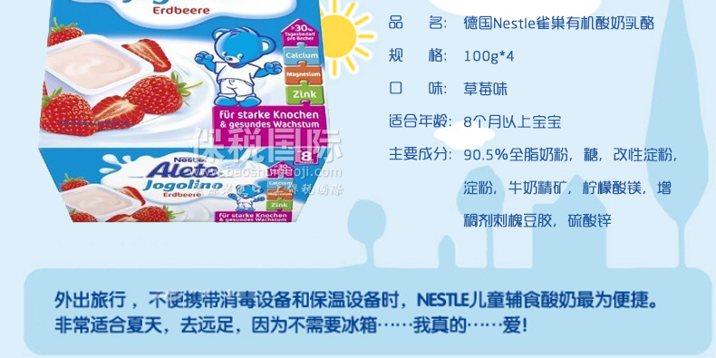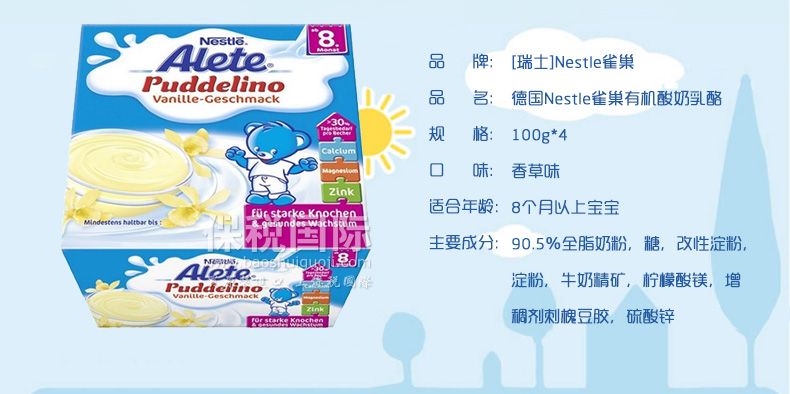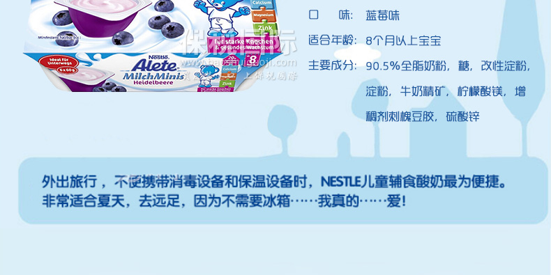 德國Nestle雀巢有機酸奶乳酪草莓藍莓水蜜桃香草 補充鈣鎂鋅8個月—— 1、方便攜帶,每杯提供20%的鈣,鎂,鋅的RDA; 2、鈣、鎂、鋅和易消化的蛋白質促進寶寶骨骼及牙齒健康成長; 3、大量的優質牛奶蛋白; 4、無人工香料、無色素、不含防腐劑。 |