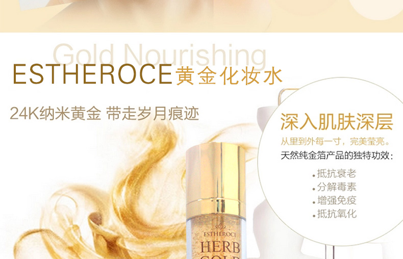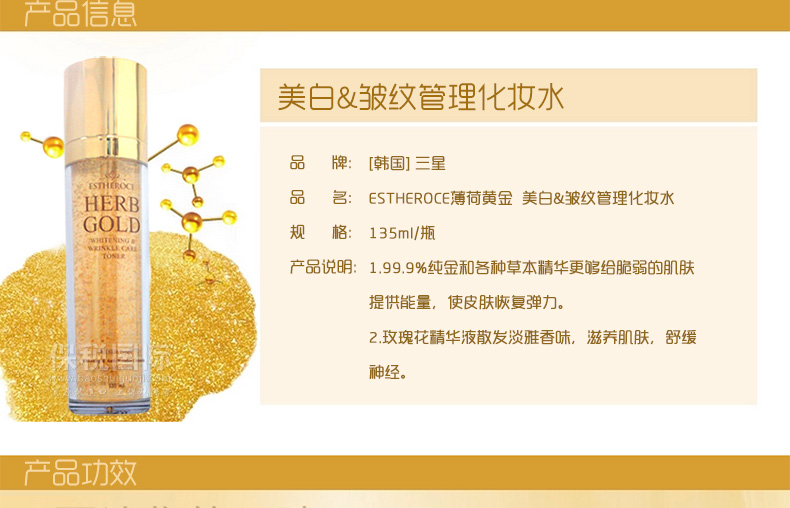 ESTHEROCE薄荷黃金 美白&皺紋管理化妝水 護(hù)膚水—— 1.99.9%純金和各種草本精華更夠給脆弱的肌膚提供能量,使皮膚恢復(fù)彈力。 2.玫瑰花精華液散發(fā)淡雅香味,滋養(yǎng)肌膚,舒緩神經(jīng)。