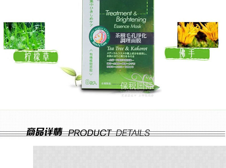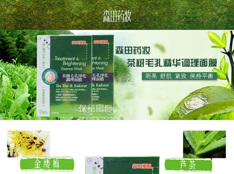 臺灣森田藥妝 茶樹毛孔凈化調理面膜(8片/盒)—— 1.集中凈化調理、緊致毛孔,持續使用、肌膚潔凈清爽、水嫩透明。 2.金縷梅: 調理、舒緩肌膚及緊致毛孔,保養油性肌膚、暗瘡性肌膚。 |