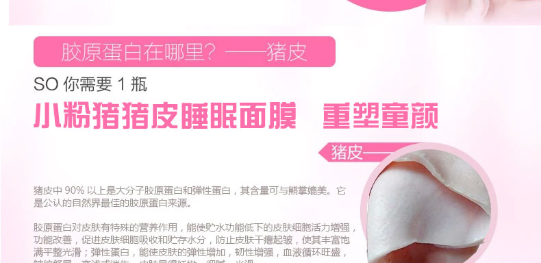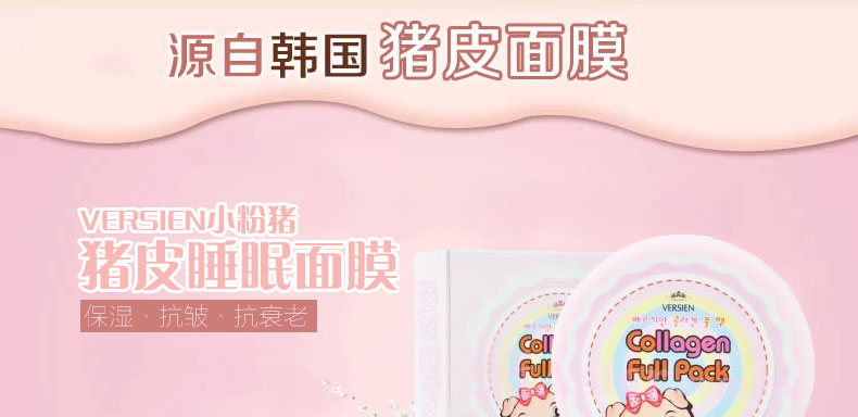 韓國 VERSIEN小粉豬 豬皮睡眠面膜 免洗式補水面膜 保濕抗皺抗衰老(100ml/瓶)—— 1.幫助干燥的肌膚補充滿滿的水分,強化保濕,生成水分膜,24小時維持水嫩嬌柔的肌膚。 2.膠原蛋白含親水性的天然保濕因子,而且三螺旋構(gòu)造,能夠強勁鎖住水分,讓皮膚時刻保持濕潤,水嫩狀態(tài)。 |