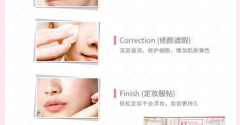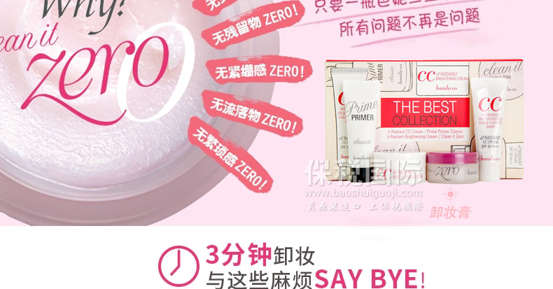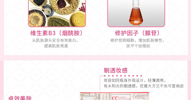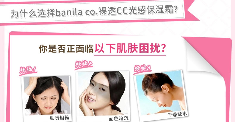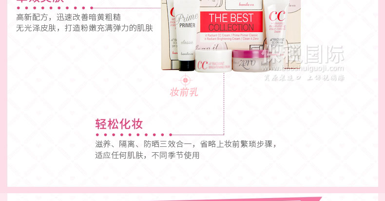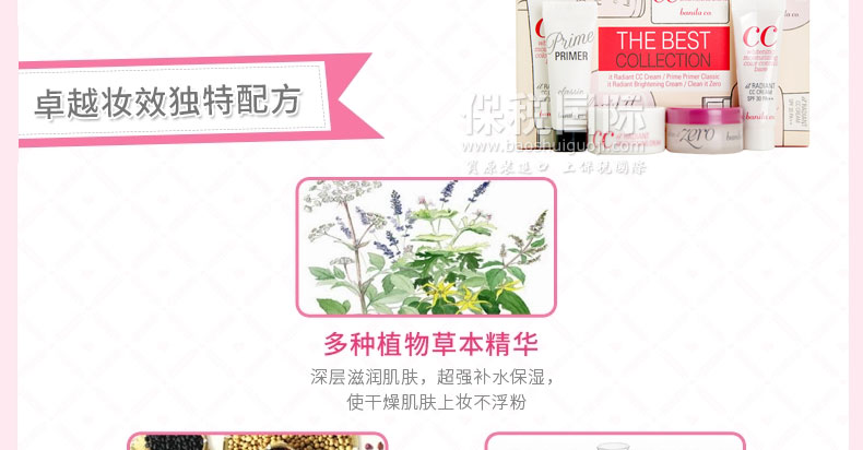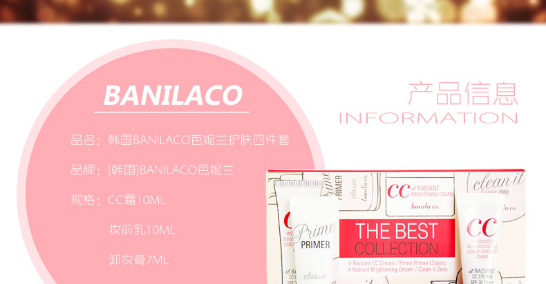 韓國 banilaco芭妮蘭護膚四件套 限量版 攜帶方便 旅游必備(卸妝膏+CC霜+妝前乳+面霜)—— 1.CC霜保濕提亮膚色,補水,超級輕薄,很透氣。上妝后明顯提亮膚色,增強肌膚光澤度。適合喜歡畫淡妝的MM。 2.妝前乳控油,這款妝前乳是隱形毛孔,修飾凹凸不平的皮膚,修飾粗糙暗沉的皮膚,讓妝容持久不脫妝。 3.隔離妝前乳,使皮膚有光澤增加透明度,后續彩妝更服帖持久,還具有一定抗皺能力。 |