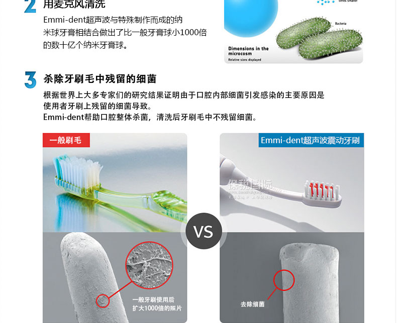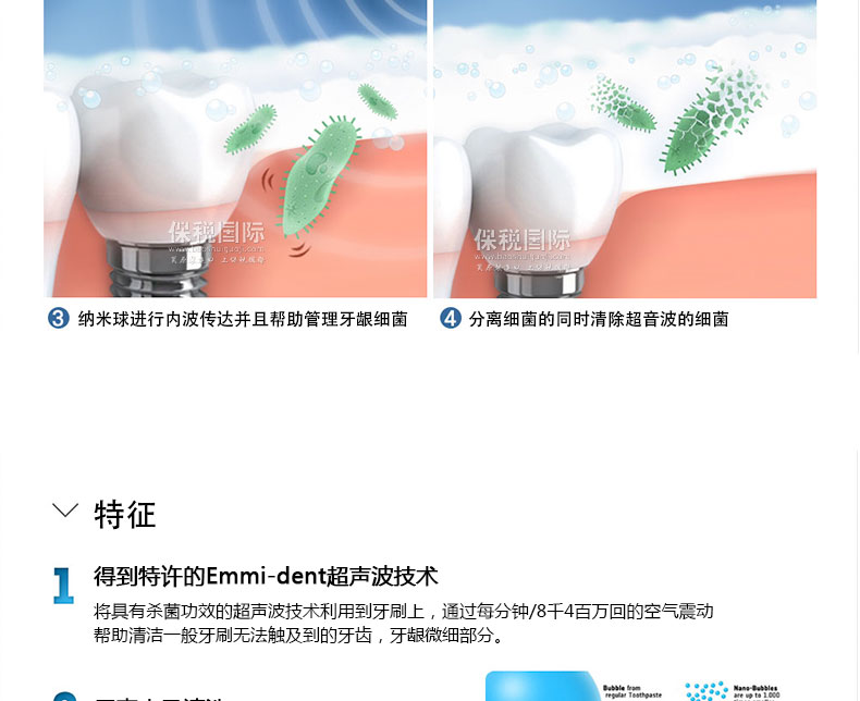Emmi-dent超聲波震動(dòng)牙刷? 充電式牙刷—— 1.殺滅牙齒表面與牙齦深處99%的細(xì)菌,預(yù)防牙齦出血及牙齦感染。 2.采用超音波清洗技術(shù)的‘Emmi-dent’的超音波以每分鐘/9千6百萬回的空氣震動(dòng)將以往牙刷,無法觸及到的附于牙齒與牙齦上的細(xì)菌殺掉。 |