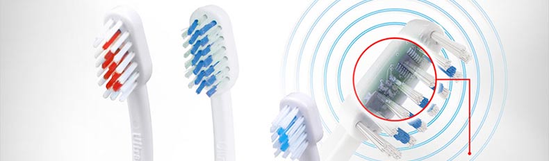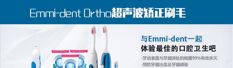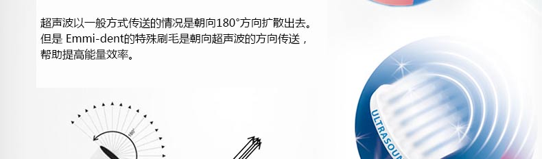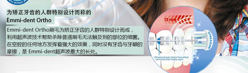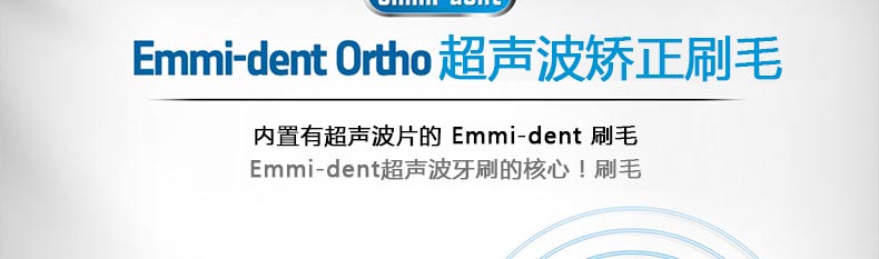 Emmi-dentOrtho 超聲波矯正刷毛? 矯正牙齒專用—— 1.殺滅牙齒表面與牙齦深處99%的細菌,預防牙齦出血及牙齦感染。 2.超聲波通過一般方式傳送時會朝著180°方向擴散。但Emmi-dent特殊牙刷會將超聲波的方向朝直線方向匯聚,從而提高能量效率。 |