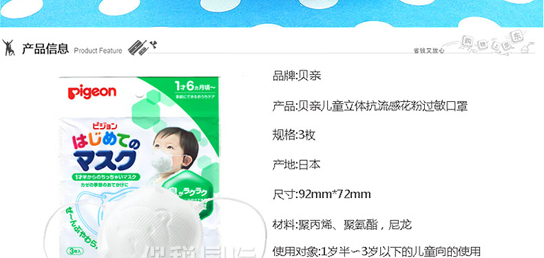 日本貝親/pigeon 兒童立體抗流感花粉過(guò)敏防PM2.5口罩 小熊口罩? 3枚入—— 1.立體圓頂,寶貝的鼻子、臉頰盒身的專用設(shè)計(jì)。 2.口罩和繩子部分完全采用柔軟的材料,經(jīng)過(guò)多重消毒,不會(huì)對(duì)寶寶的皮膚造成負(fù)擔(dān)。 3.可愛(ài)小熊造型,萌萌噠。 4.一次性使用,安全衛(wèi)士。 |
