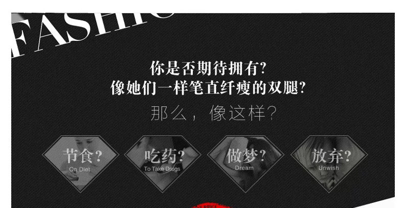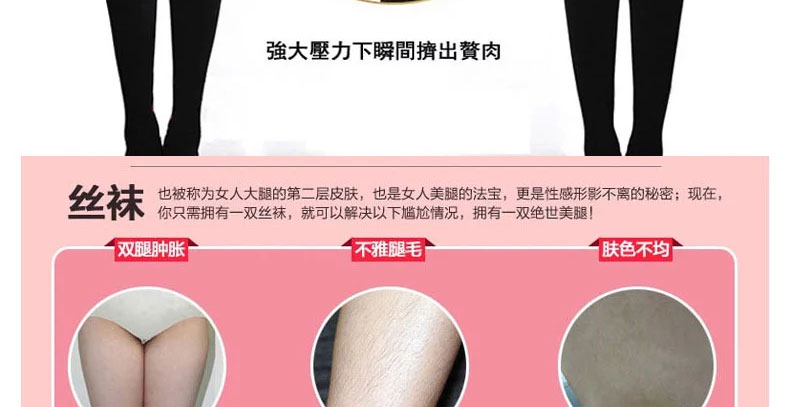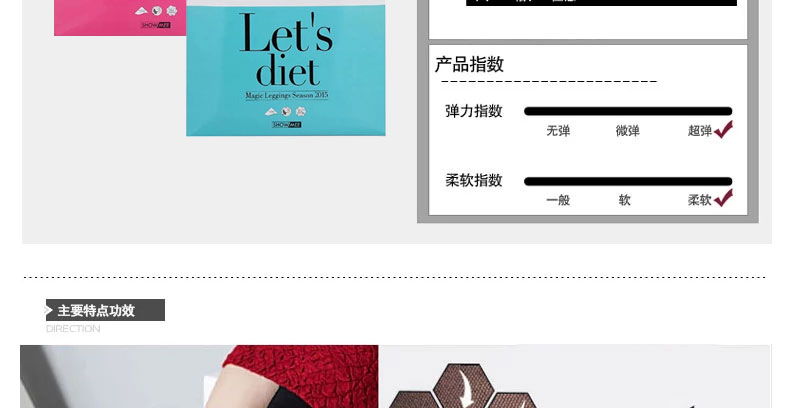 韓國 Show Mee瘦腿襪 Let's diet提臀襪 燃溶體脂提臀瘦腿襪—— 1.采用精選包芯絲,手感柔軟細膩,上身后膚色均勻,有美肌效果。 2.百搭黑色,貼心設計,不同的場合,衣服對應著不同顏色搭配需求。 3.貼心的舒適設計,不會有露出的尷尬,襠部緊實,不掉檔,穿著舒適透氣。 |