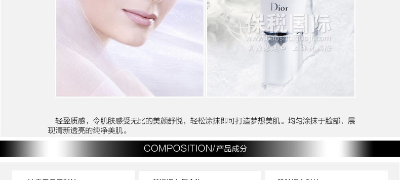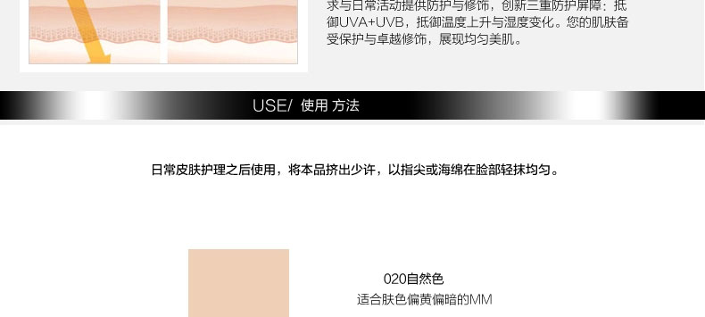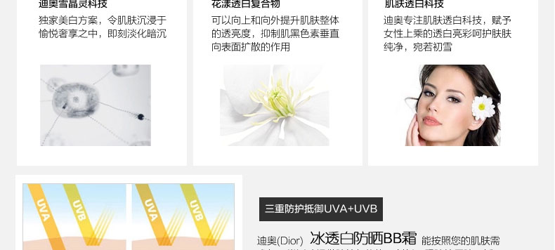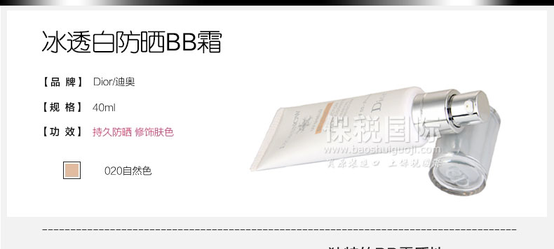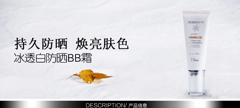 法國dior迪奧 snow雪晶靈/雪精靈 冰透白防曬BB霜 020自然色 SPF50(40ml/支)—— 1.蘊含獨家新一代色彩改善色素,將保護盒修飾作用合成,能遮蓋臉上瑕疵之外還能淡化斑點。 2.不含油分的隔離霜,含有豐富的飾色粒子,可保護肌膚。 3.有效保護肌膚不受紫外線輻射和自由基的傷害。 |