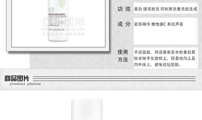 有效美白,讓肌膚乳羊脂般柔嫩有光澤。為肌膚提供補濕功效,塑造水潤凈白肌膚,大大提升肌膚實時亮白度。產品讓肌膚更易吸收其后的滋潤產品,紓緩、潤澤肌膚,讓肌膚回復嫩白剔透。