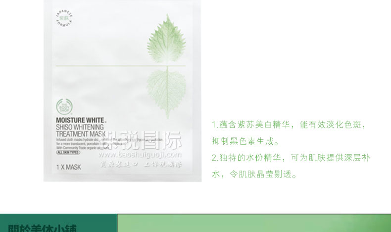 英國(guó) The Body Shop 美體小鋪?zhàn)咸K水分美白重點(diǎn)修護(hù)面膜? 針對(duì)性護(hù)理 效果極佳 4片裝—— 1.蘊(yùn)含紫蘇美白精華,能有效淡化色斑,抑制黑色素生成。 2.獨(dú)特的水份精華,可為肌膚提供深層補(bǔ)水,令肌膚晶瑩剔透。 |