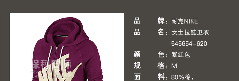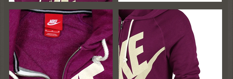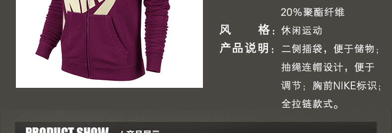 美國NIKE耐克2014冬款女運動茄克女士拉鏈衛衣545654-620—— 1、二側插袋,便于儲物; 2、抽繩連帽設計,便于調節; 3、胸前NIKE標識; 4、全拉鏈款式。 |