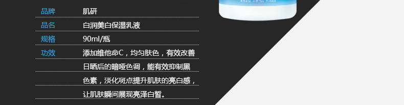 肌研白潤美白保濕乳液90ml 讓肌膚天天喝牛奶—— 1.結合多種透明質酸加倍滋潤,配合雙重亮白因子,締造凈白剔透的肌膚。 2.添加維他命C,均勻膚色,有效改善日曬后的暗啞色調,提升肌膚的亮白感,讓肌膚瞬間展現亮澤白皙。 3.弱酸性,低刺激性,不含香料,色素及礦物油。 |