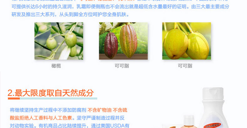 富含維生素E可以將因日曬、污染、壓力產生的自由基中和,保護肌膚。對抗肌膚出現的細紋、松弛、暗斑等況。促進皮膚微血管循環,讓皮膚看起來自然紅潤有活力。乳液能夠迅速深層滋潤,解決肌膚干燥、開裂、粗糙、等問題,恢復健康狀態。長期使用能保持肌膚細致柔軟的健康狀態并使它更加富有彈性。適合全身使用。