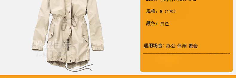 Timberland添柏嵐 連帽防水風衣 女士外套 白色中長款外套4927J 284—— 1.收腰設計,燕尾下擺,挺拔帥氣又顯瘦。 2.面料不褪色,柔軟親膚,不易起球,不縮水。 |