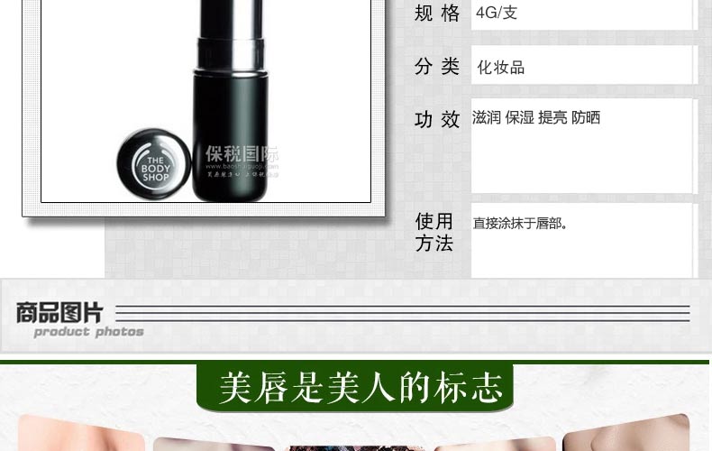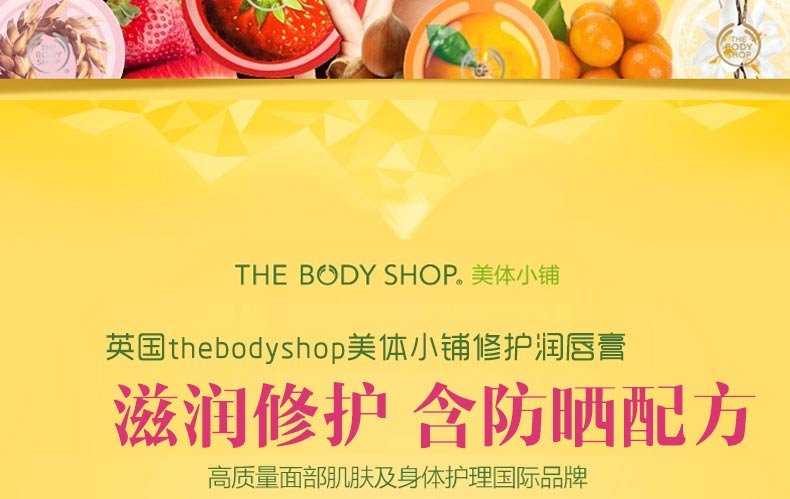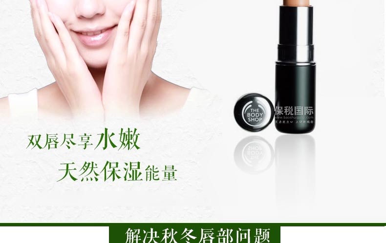 英國thebodyshop美體小鋪潤唇膏修復防曬超保濕滋潤無色透明護唇膏—— 1、漆樹果仁油,有效滋潤肌膚,使肌膚長期保持最佳狀態; 2、維他命E,抗氧化成份,有效軟化、修護及保護肌膚; 3、防曬配方,提供中度防曬,阻隔紫外光UVB。 |
