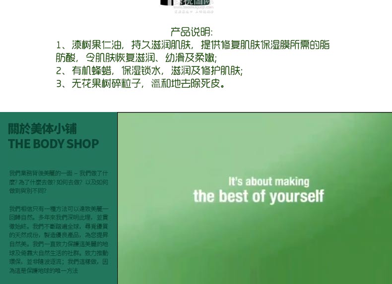 英國thebodyshop 美體小鋪去角質保濕磨砂護唇膏 磨砂膏—— 1、漆樹果仁油,持久滋潤肌膚,提供修復肌膚保濕膜所需的脂肪酸,令肌膚恢復滋潤、幼滑及柔嫩。 2、有機蜂蠟,保濕鎖水,滋潤及修護肌膚。 3、無花果樹碎粒子,溫和地去除死皮。 使用方法:溫和的涂上唇部磨砂,輕輕磨擦,然后用紙巾擦除殘余物。可按需要每星期使用一至次。 |