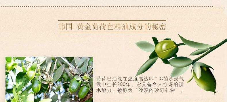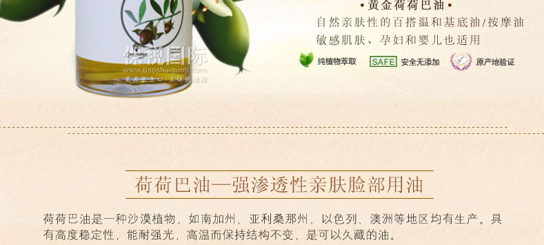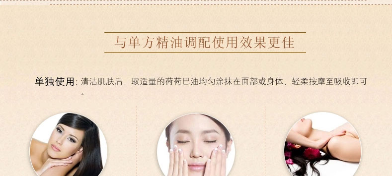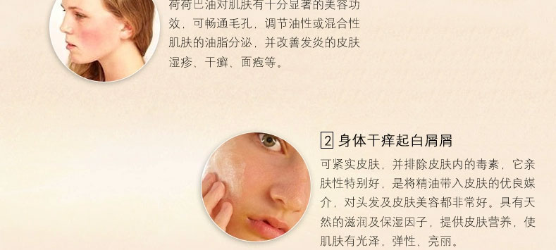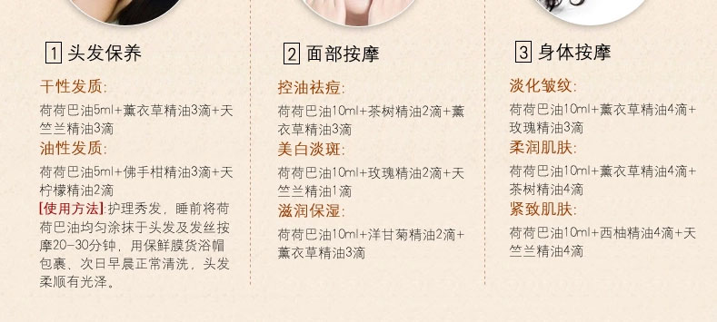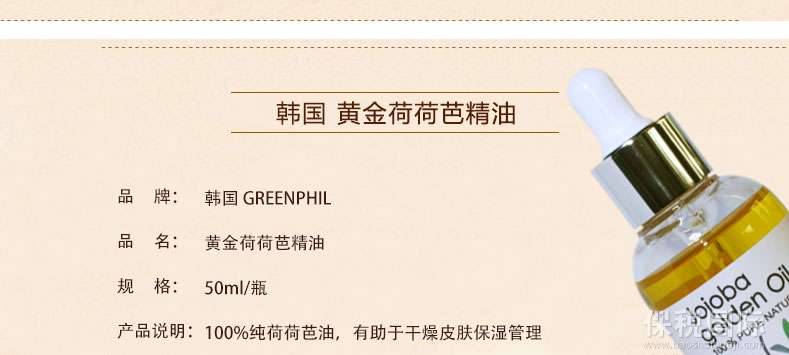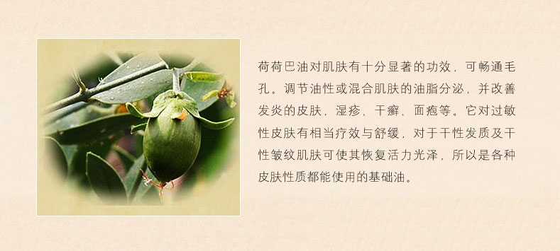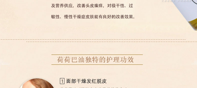 黃金荷荷芭精油? 50ml/瓶 —— 100%純荷荷芭油,有助于干燥皮膚保濕管理及營(yíng)養(yǎng)供應(yīng),改善頭皮瘙癢,對(duì)極干性、過敏性、慢性干燥癥皮膚能有良好的改善效果。 |