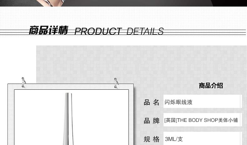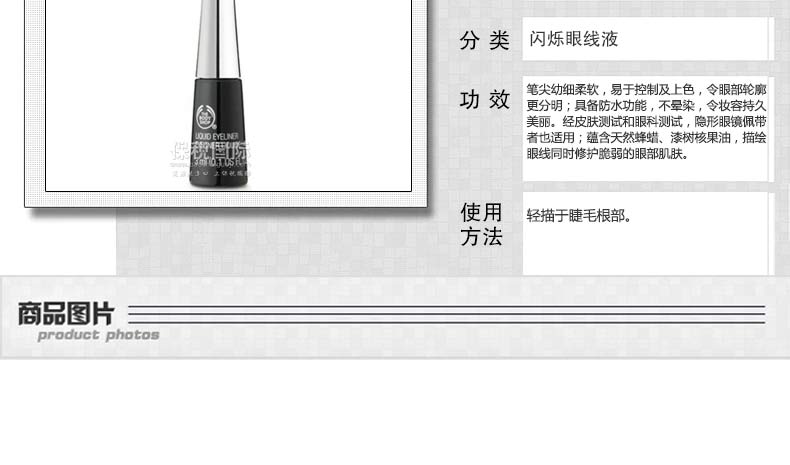 英國thebodyshop美體小鋪 GILTTER EYELINER閃爍眼線液3ml防水持久—— 1、含漆樹核果油/維他命E; 2、筆尖幼細柔軟,易于控制及上色,令眼部輪廓更分明; 3、具備防水功能,令妝容持久美麗。 |