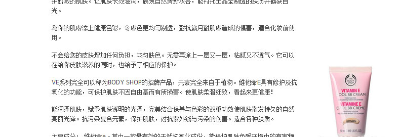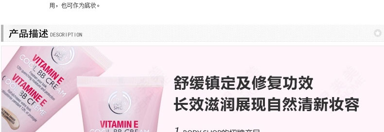 英國(guó) The Body Shop 美體小鋪維他命E水凝透薄BB霜? 補(bǔ)水遮瑕 打造自然膚色 50ml—— 1.質(zhì)感輕盈,易涂抹,易吸收。 2.12小時(shí)補(bǔ)水,持久有效。 3.遮瑕效果極佳,色調(diào)柔和自然。 使用方法:潔面、爽膚及潤(rùn)膚后,以手指將BB霜輕輕向外涂抹于面上。可單獨(dú)或作妝前底霜使用。 |