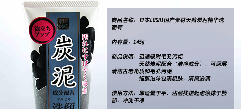 Loshi炭泥洗顏泡沫去角質洗面乳/洗面奶 性質溫和,清爽自然—— 1.加入天然礦物泥及活性炭成分吸收毛孔中的污垢,控制多余油脂分泌,容易洗去過份的油脂,將黑頭和粉刺的煩惱帶走。 2.通過天然炭的礦物元素,補充肌膚所需營養,均勻膚色,使肌膚晶瑩剔透。 3.性質溫和,清爽自然,洗后光滑清爽不緊繃! |