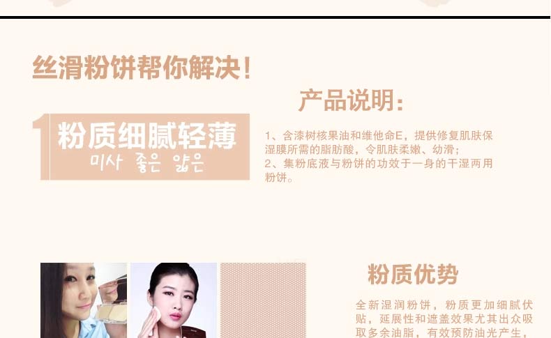 英國thebodyshop美體小鋪ALL-IN-ONE 干濕兩用保濕無暇粉餅—— 1、含漆樹核果油和維他命E,提供修復肌膚保濕膜所需的脂肪酸,令肌膚柔嫩、幼滑; 2、集粉底液與粉餅的功效于一身的干濕兩用粉餅。 使用方法:要擁有透薄啞致的妝效,可使用附有的粉樸沾上粉底,均勻掃于面上;若想帶出較高的遮瑕度,可輕輕沾濕濕粉樸或濕粉掃,沾上粉底后均勻掃于面上。 |