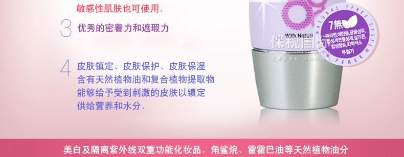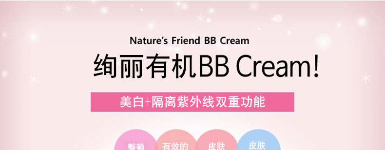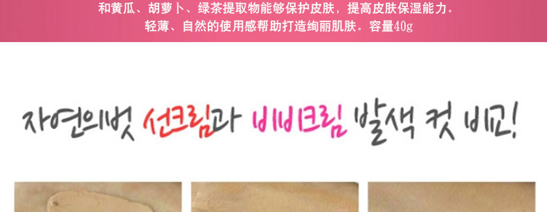 韓國第一眼絢麗 BB霜 美白+隔離紫外線雙重功能40g/支—— 1.向敏感性肌膚推薦,非化學(xué)性阻斷紫外線,使用微粒子,敏感性肌膚也可使用。 2.含有天然植物油和復(fù)合植物提取物,能夠給予受到刺激的皮膚以鎮(zhèn)定,供給營養(yǎng)和水分。 |