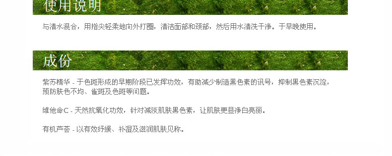 成 分:紫蘇精華 維他命C 有機蘆薈。 |