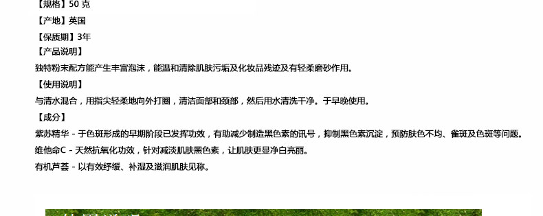 英國 The Body Shop 美體小鋪紫蘇水分美白潔面粉 豐富泡沫 去污控油 美白—— 1.抑制黑色素沉淀,預防膚色不均、雀斑及色斑等問題。 2.天然抗氧化功效,針對減淡肌膚黑色素,讓肌膚更顯凈白亮麗。 3.有效紓緩、補濕及滋潤肌膚。 使用方法:與清水混合,用指尖輕柔地向外打圈,清潔面部和頸部,然后用水清洗干凈。于早晚使用。 注:敏感肌膚慎用,可隱蔽處進行皮膚測試后使用。 |