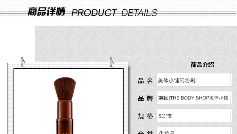 英國thebodyshop美體小鋪蜜糖古銅閃粉刷散粉刷腮紅刷—— 1、刷毛主要成分是合成纖維,不含動物毛發(fā),比動物刷毛更安全,可避免細菌產生; 2、質地柔軟,觸感絕佳,易于打理。 |