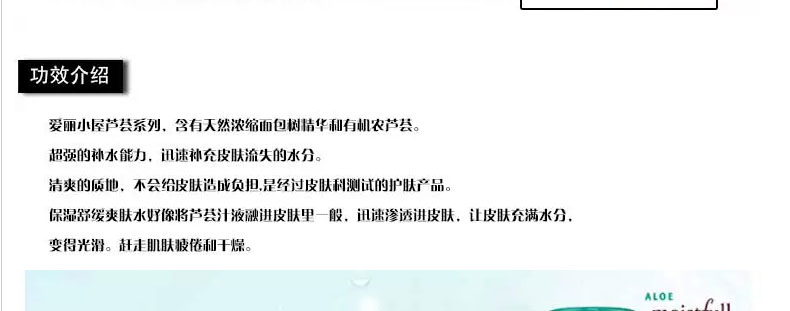 韓國 Etude House愛麗小屋 水分滿滿蘆薈爽膚水 鎮定補水(180ml/瓶)—— 1.不含礦物油、防腐劑和滑石成分。 2.含有4500mg有機農蘆薈成分。 3.含有天然濃縮面包樹精華和有機農蘆薈。 4.有超強的補水能力和鎮定肌膚鎖住水分。 5.能迅速給肌膚補充水分,鎖住水分停留在肌膚深層。 6.清爽的質地,不會給皮膚造成負擔。 7.是經過皮膚科測試的護膚產品。 注:敏感肌膚慎用,可隱蔽處進行皮膚測試后使用。 |