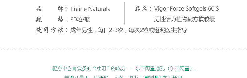 加拿大Vigor Force Softgels 60'S男性活力植物配方軟膠囊(60粒/瓶)—— 配方中含有眾多的“壯陽”的成分 – 東革阿里插孔(東革阿里),薔薇紅景天,白蒺藜,人參,銀杏,鋸棕櫚和南瓜籽油。 |