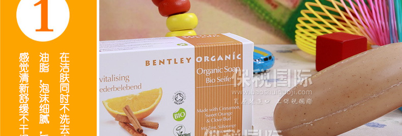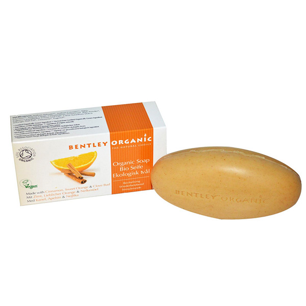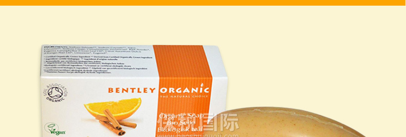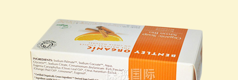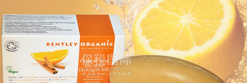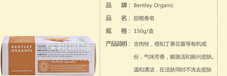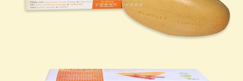 英國Bentley Organic甜橙香皂 氣味芳香激活振興皮膚 150g/盒—— 1.含肉桂,橙和丁香花蕾等有機成份,氣味芳香,能激活和振興皮膚。 2.溫和清潔,在潔膚同時不洗去皮膚的天然油脂,泡沫細膩,香味怡人,感覺清新舒緩不干燥緊繃。 |