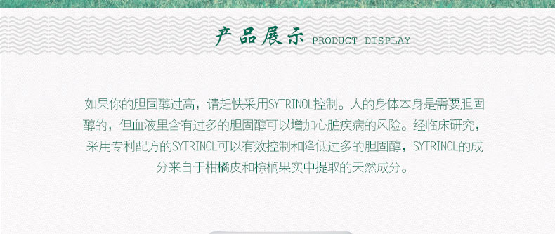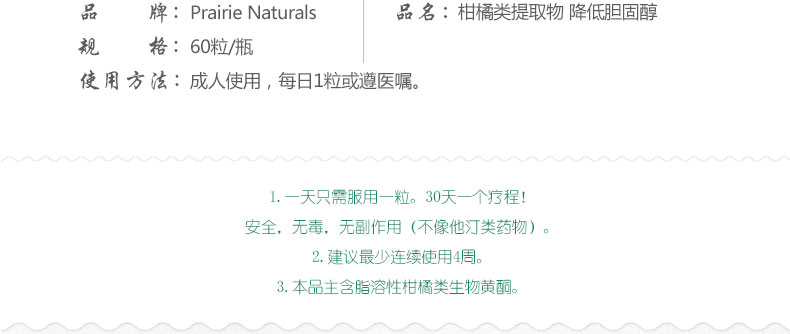 加拿大SYTRINOL 60 VCAPS大草原柑橘類提取物降低膽固醇膠囊 保健品(60粒/瓶)—— 1.一天只需服用一粒。30天一個(gè)療程!安全,無毒,無副作用(不像他汀類藥物)。 2.建議最少連續(xù)使用4周。 3.本品主含脂溶性柑橘類生物黃酮。 |