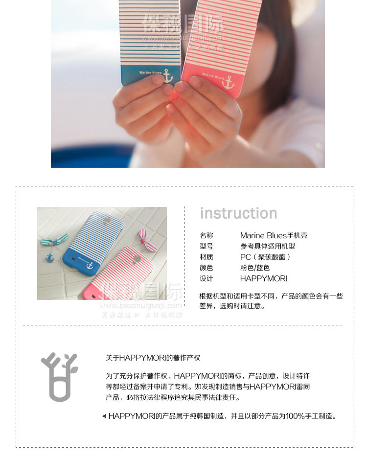 韓國Happymori仲夏Marine Blues粉色條紋手機殼—— 1.PC材質(zhì),耐熱,耐沖擊,抗摔,且不易變形 2.設(shè)計簡約,大方,充滿朝氣,凸顯少女的可愛 備注:硬質(zhì)材料在大的沖擊下容易破損,使用時請格外注意! |