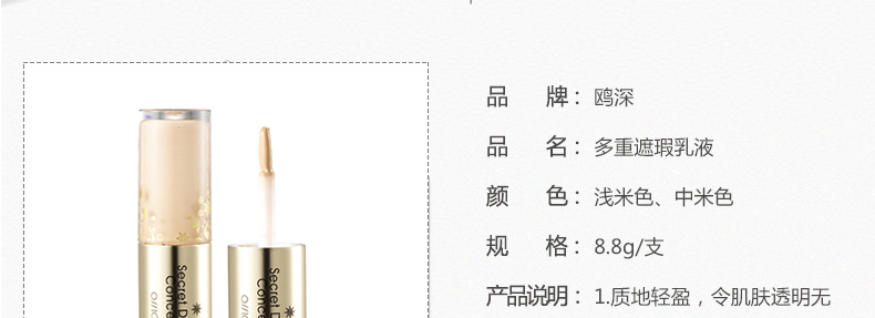 產(chǎn)品說(shuō)明 韓國(guó)鷗深多重遮瑕乳液(淺米色、中米色)  雙重式樣 8.8g/支——