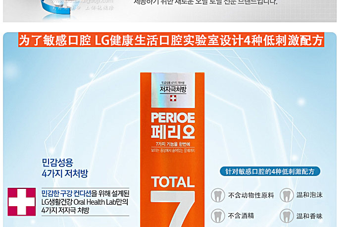 韓國 LG 生活PERIOE倍瑞奧橙色抗過敏七效合一綜合性牙膏120g /支—— 從看得到的癥狀到隱藏的問題,具有7種功能的均衡口腔管理。為了敏感口腔而設計的4種低刺激配方。配方能夠控制口腔細菌Perioe total7 提供這樣的均衡口腔管理解決辦法,是最新的total專業品牌。 |
