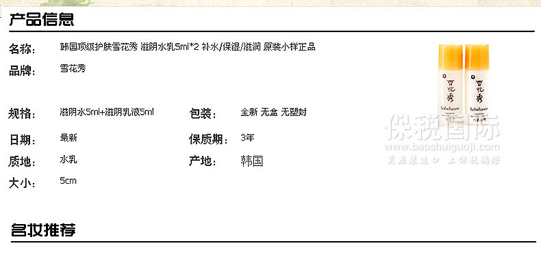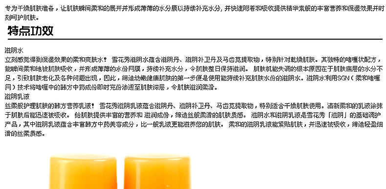 雪花秀小樣套裝 滋陰水5ml/瓶*2+乳5ml/瓶*2 補水保濕—— 1.馬齒莧有效為肌膚補濕,地骨皮則具有紓緩作用,鎮靜安撫肌膚并加強深層補濕功效。 2.牡丹皮可軟化膚質,杭菊精華則有效促進血氣運行,凈化肌膚。 |