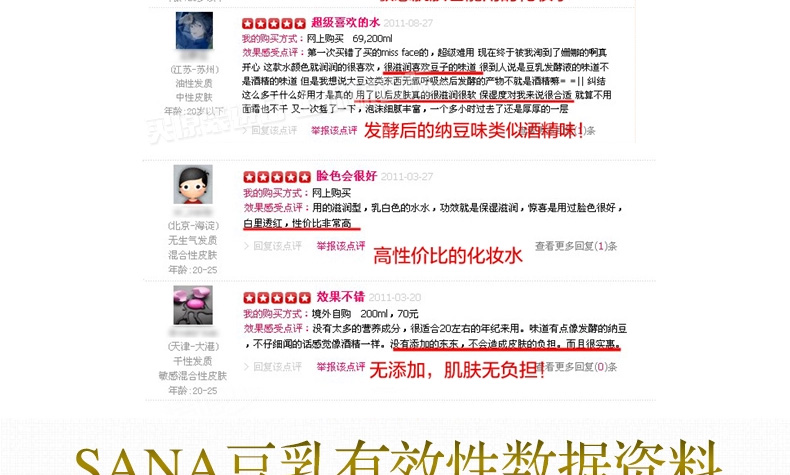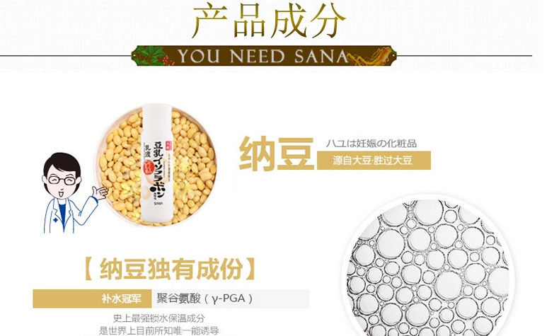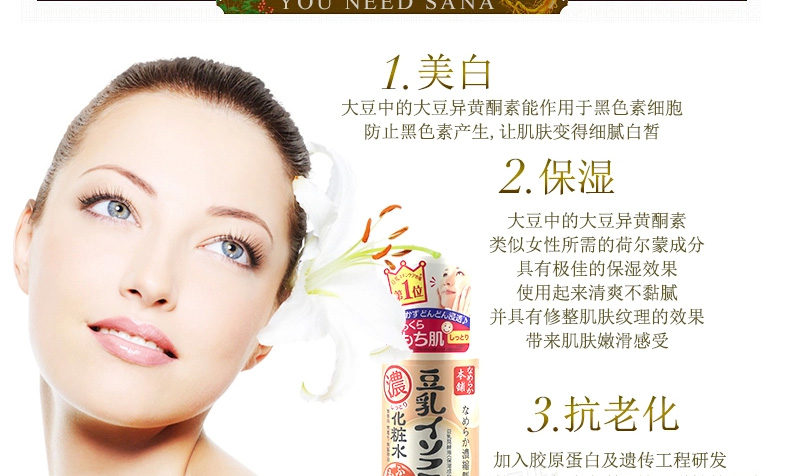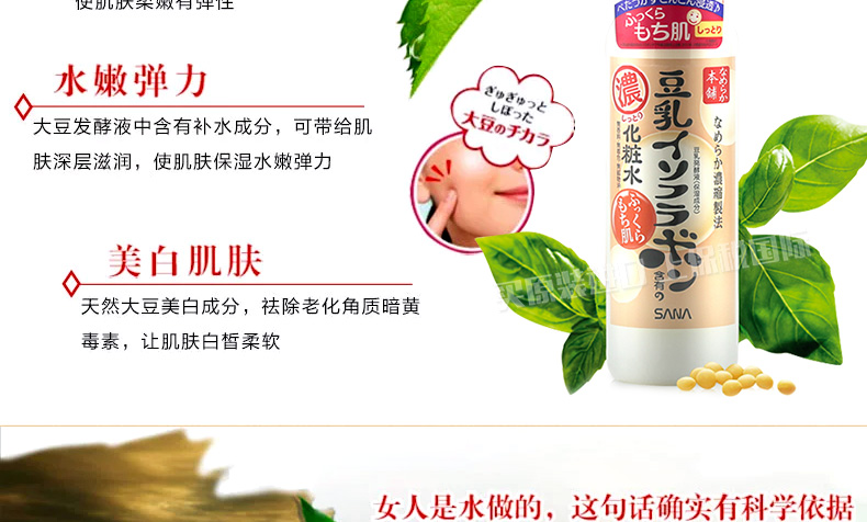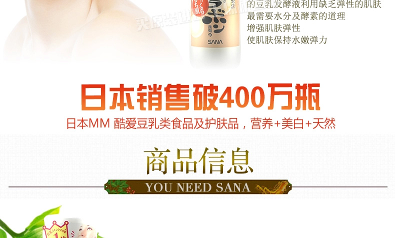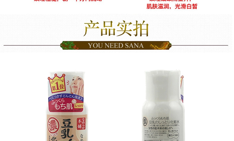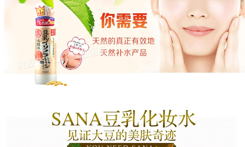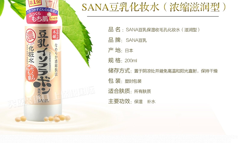 日本SANA莎娜 濃縮滋潤型豆乳美肌化妝水 水嫩補水保濕水 200ml/瓶—— 1、蘊含納豆獨有成分,聚谷氨酸,并含活性卵磷脂,活性多肽,有效滋潤肌膚。 2、美白、保濕、抗老化,保持皮膚水嫩彈性。 3、深度保濕,清爽不黏膩,還能做保濕噴霧哦! 注:敏感肌膚慎用,可隱蔽處進行皮膚測試后使用。 |