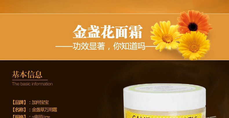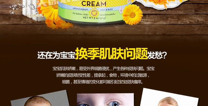 美國(guó) California Baby/加州寶寶? 金盞花寶寶面霜 預(yù)防緩解濕疹 57g/瓶—— 1、純植物配方成分,預(yù)防濕疹,天然消炎,深度補(bǔ)水。 2、蘊(yùn)含有機(jī)可持續(xù)生長(zhǎng)因子,刺激細(xì)胞再生。 3、FDA有機(jī)認(rèn)證冷壓工藝,溫和、安全、收斂。 4、專(zhuān)門(mén)為兒童和過(guò)敏性肌膚成人打造。 |
