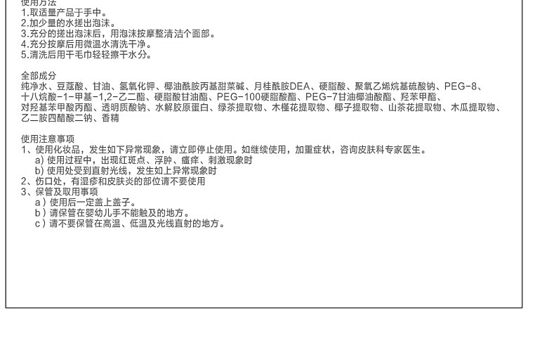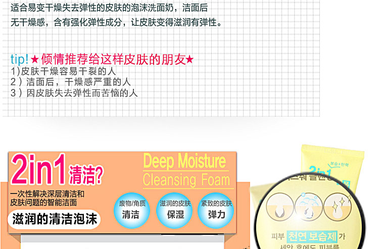不同于普通的洗面奶,一次性解決深層清潔和皮膚問(wèn)題的泡沫洗面奶。適合易變干燥失去彈性的皮膚的泡沫洗面奶,潔面后無(wú)干燥感,含有強(qiáng)化彈性成分,讓皮膚變得滋潤(rùn)有彈性。含有皮膚天然保濕成分玻尿酸,提升皮膚保濕感,含有膠原蛋白給皮膚帶來(lái)彈力。潔面后無(wú)緊繃感,帶來(lái)滋潤(rùn)柔軟的皮膚。 |