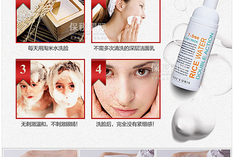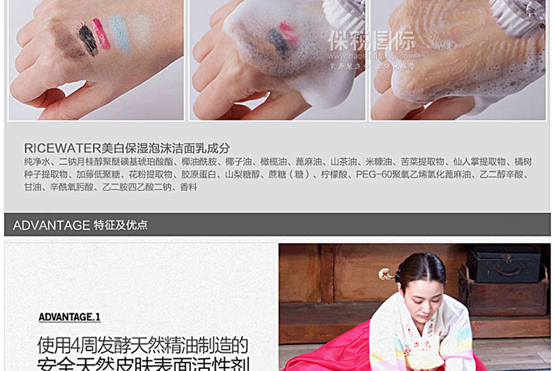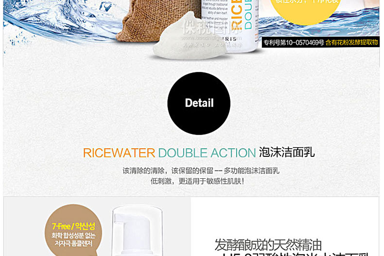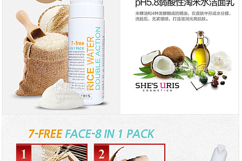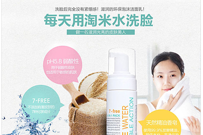 韓國SHE'S URIS RICEWATER 維他命潔凈保濕雙效潔面泡沫 150ml—— 1. 蘊含維他命和無機物豐富的高濃縮米糠油。 2. RICEWATER美白保濕泡沫潔面乳ph5.8弱酸性,對受荷爾蒙的影響皮脂分泌過多的成長期的孩子或敏感的皮膚也可以放心使用。 3. 只發酵和提取對皮膚有益的有效營養,快速為皮膚補充營養。 4. 不添加對皮膚不好的有害成分對羥基苯甲酸酯、人工色素、二苯甲酮、合成表面活性劑、礦物性油、酒精、鄰苯二甲酸酯的天然泡沫潔面乳,對皮膚無刺激。 |
