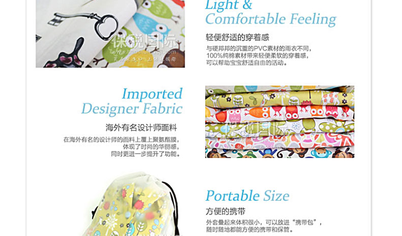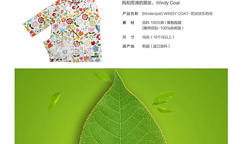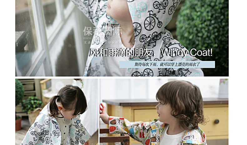 風(fēng)雨中保護(hù)寶寶的時(shí)尚風(fēng)衣 有風(fēng)的日子用作擋風(fēng)衣,下雨的日子用作雨衣,黃沙大的日子用作安心的保護(hù)膜,天氣好的日子用作時(shí)尚外套。 1. 韓國嬰幼兒用品界第一企業(yè)(株)petitelin的品牌。 2. 刮風(fēng)的日子、下雨的日子、黃沙大的日子保護(hù)寶寶。 3. 與硬邦邦的沉重的PVC素材的雨衣不同,100%純棉素材帶來輕便柔軟的穿著感,可以幫助寶寶舒適自由的活動(dòng)。 4. 在海外有名的設(shè)計(jì)師的面料上覆上聚氨酯膜,體現(xiàn)了時(shí)尚的華麗感,同時(shí)更進(jìn)一步提升了功能。 5. 外套疊起來體積很小,可以放進(jìn)“攜帶包”,隨時(shí)隨地都能方便的攜帶和保管。 |