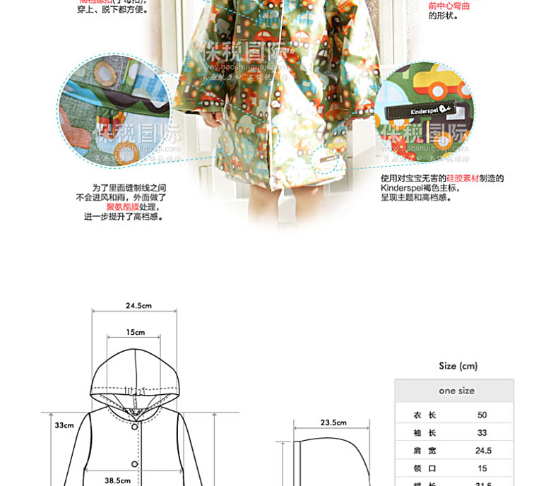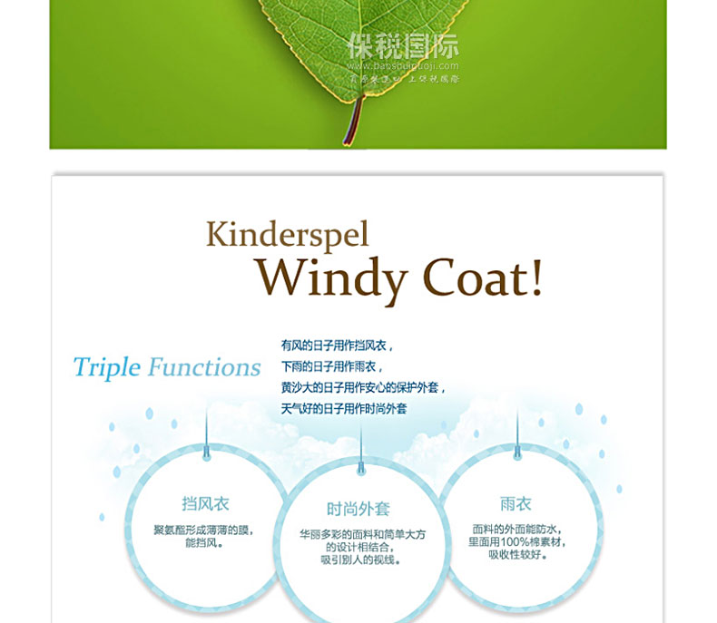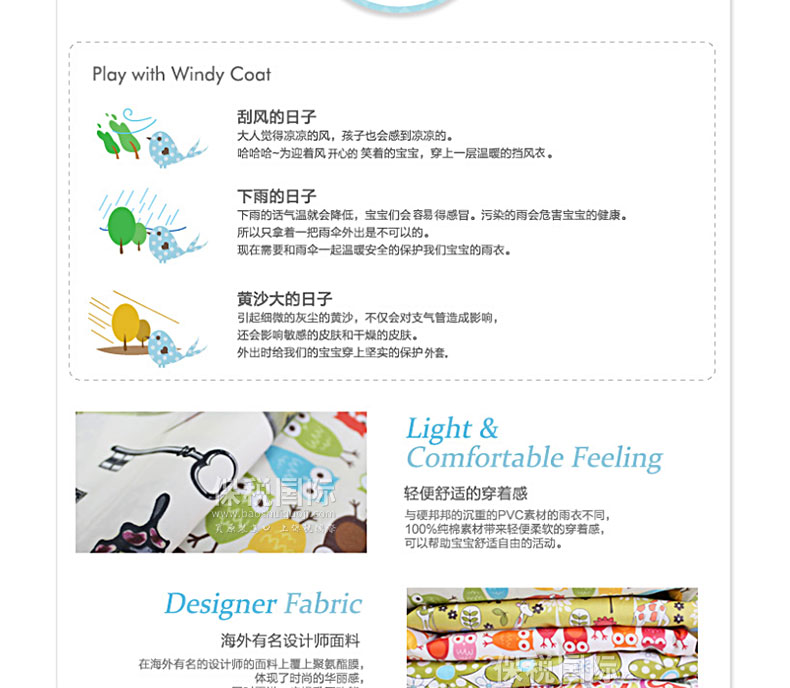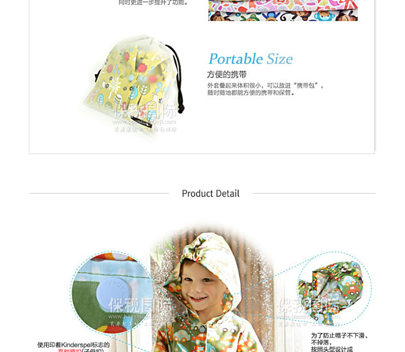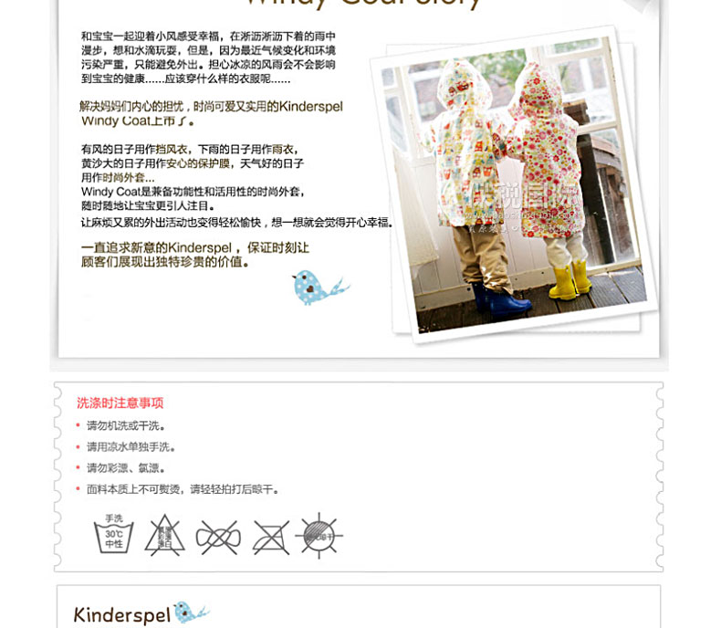 風(fēng)雨中保護(hù)寶寶的時(shí)尚風(fēng)衣 有風(fēng)的日子用作擋風(fēng)衣,下雨的日子用作雨衣,黃沙大的日子用作安心的保護(hù)膜,天氣好的日子用作時(shí)尚外套。 1. 韓國(guó)嬰幼兒用品界第一企業(yè)(株)petitelin的品牌。 2. 刮風(fēng)的日子、下雨的日子、黃沙大的日子保護(hù)寶寶。 3. 與硬邦邦的沉重的PVC素材的雨衣不同,100%純棉素材帶來(lái)輕便柔軟的穿著感,可以幫助寶寶舒適自由的活動(dòng)。 4. 在海外有名的設(shè)計(jì)師的面料上覆上聚氨酯膜,體現(xiàn)了時(shí)尚的華麗感,同時(shí)更進(jìn)一步提升了功能。 5. 外套疊起來(lái)體積很小,可以放進(jìn)“攜帶包”,隨時(shí)隨地都能方便的攜帶和保管。 |