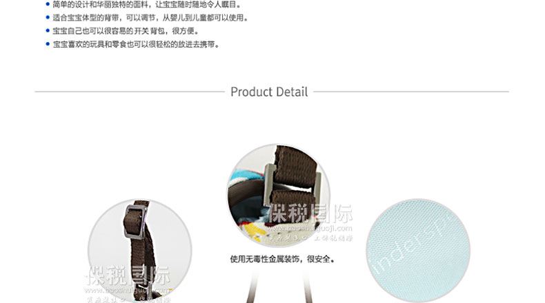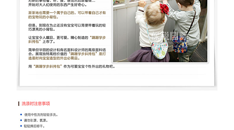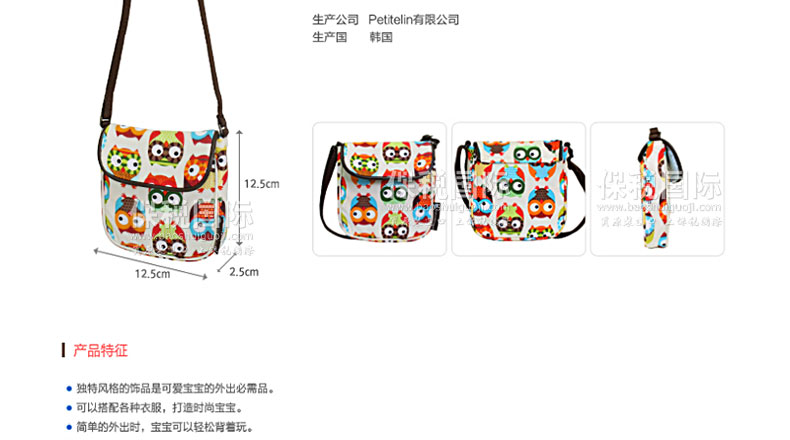 為可愛寶寶特別設計的外出必需品斜挎包 1. 韓國嬰幼兒用品界第一企業(株)petitelin的品牌。 2. 獨特風格的飾品是可愛寶寶的外出必需品。 3. 可以搭配各種衣服,打造時尚寶寶。 4. 簡單的外出時,寶寶可以輕松背著玩。 5. 簡單的設計和華麗獨特的面料,讓寶寶隨時隨地令人矚目。 6. 適合寶寶體型的背帶,可以調節,從嬰兒到兒童都可以使用。 7. 寶寶自己也可以很容易的打開關上背包,很方便。 8. 寶寶喜歡的玩具和零食也可以很輕松的放進去攜帶。 |