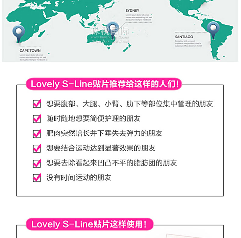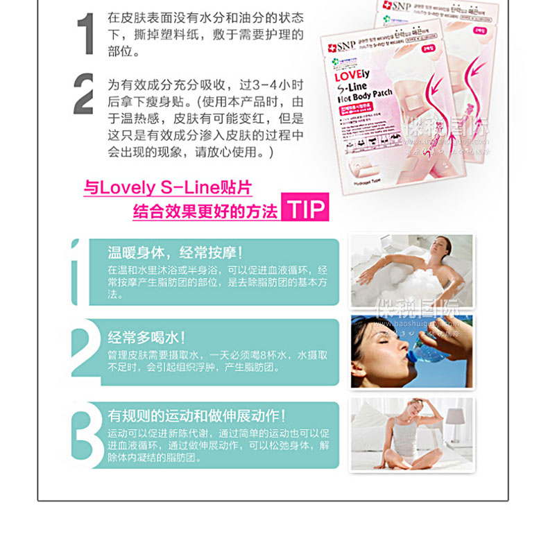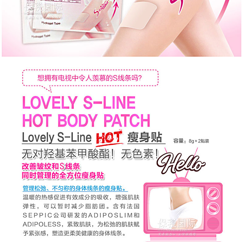 韓國人氣藥妝SNP Lovely系列S-Line瘦身貼(2貼裝)—— 1. 改善皺紋和V線條同時管理的全方位瘦身貼。 2. 管理松弛、不勻稱的身體線條的瘦身貼。 3. 溫暖的熱感促進有效成分的吸收,增強肌膚彈性,可以暫時減少脂肪團。 4. 含有法國SEPPIC公司研發的ADIPOSLIM和ADIPOLESS,緊致肌膚,為松弛的肌膚賦予緊張感,塑造更柔美健康的身體線條。 |