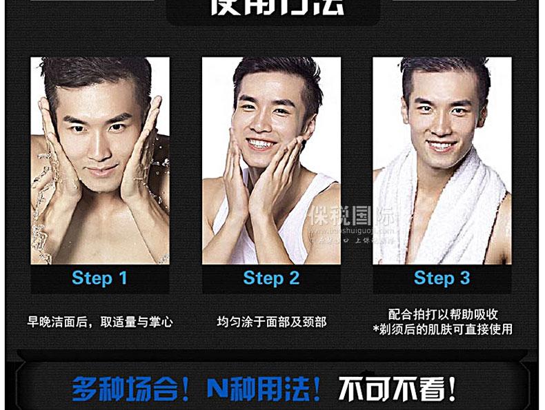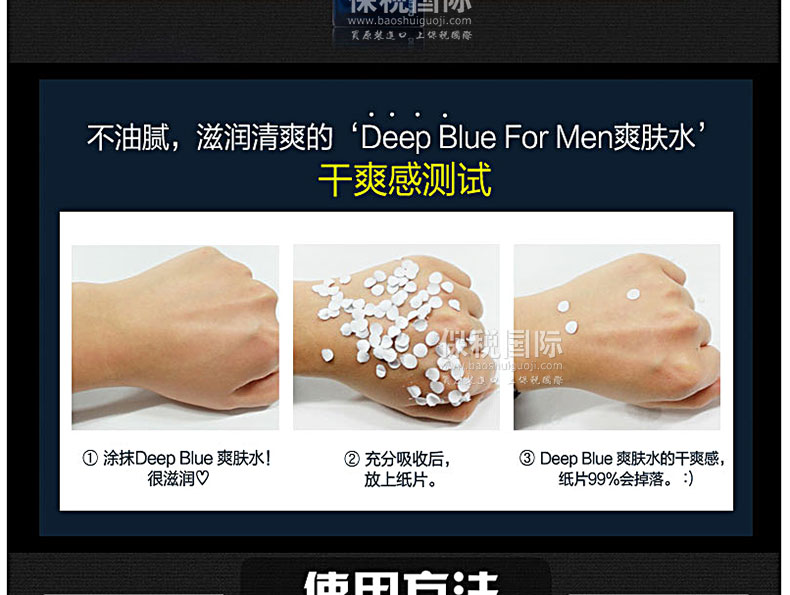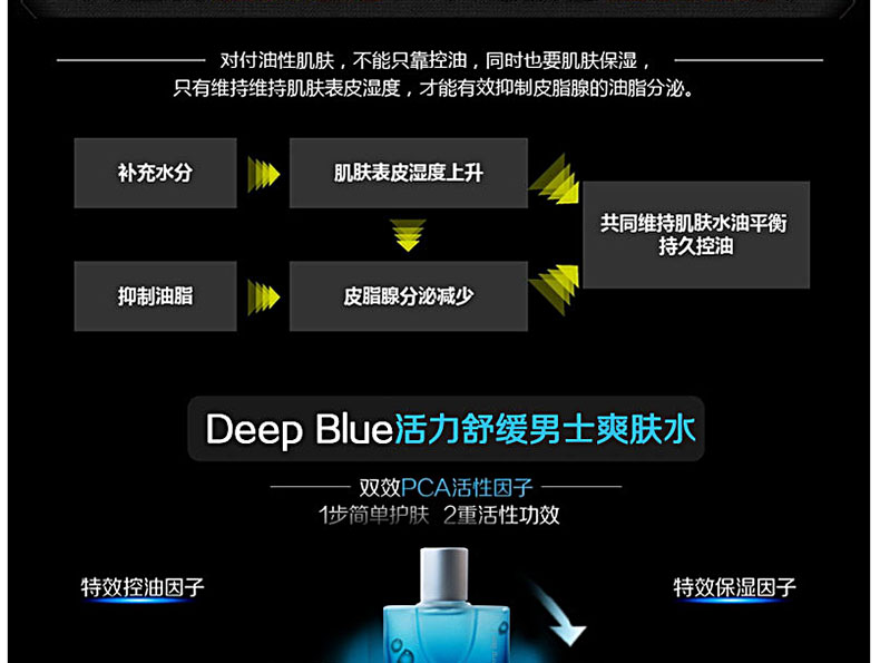 韓國人氣藥妝SNP 男士Deep Blue系列活力舒緩爽膚水 130ml—— 1. 鎮(zhèn)定剃須后敏感的肌膚,潤膚的清爽型男士專用爽膚水。受男性青睞的賦予肌膚水潤的清爽型護(hù)膚品。 2. 無對(duì)羥基苯甲酸酯、無色素。提供水分、鎮(zhèn)定皮膚。 3. 含有美白功能性成分‘煙酰胺’,令暗沉肌膚干凈白皙。 4. 為眼角和嘴角、額頭等容易產(chǎn)生粗紋的皮膚補(bǔ)充水分,24小時(shí)滋潤肌膚。