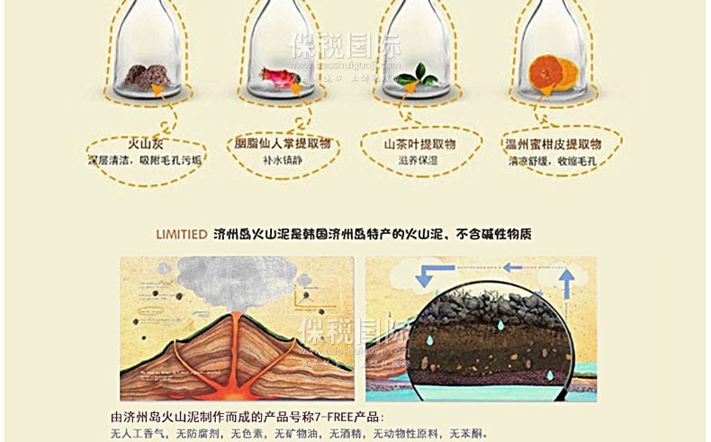1. 內含濟州島天然火山泥,強力吸附毛孔油脂,深層清潔肌膚。 2. 清除誘發皮膚敏感的皮膚分泌物,集中改善暗沉,黑頭,油脂等問題,打造潔凈透亮肌膚。 3. 無人工香料,無防腐劑,無色素,無礦物油,無酒精,無動物性原料,安全天然,任何肌膚可安心使用。 4. 含仙人掌,山茶,橘皮等天然提取物,具有補水滋養,清涼舒緩,收縮毛孔的功效。 |