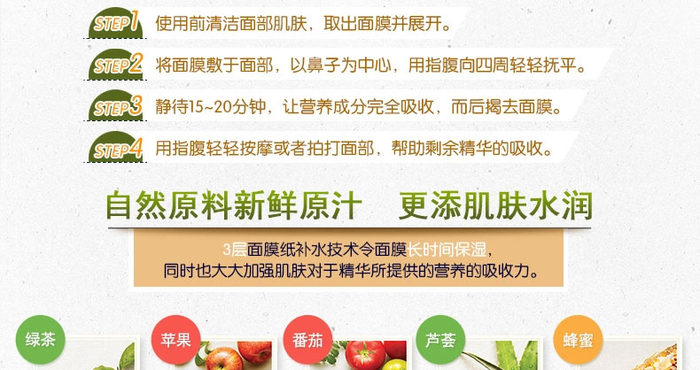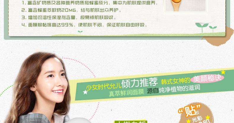 1. 富含礦物質(zhì)及各種營養(yǎng)物質(zhì)和蜂蜜成分,集中為肌膚提供營養(yǎng),持久保濕。 2. 富含蜂蜜萃取物20MG,給與肌膚出眾養(yǎng)護(hù)。 3. 增加可溶性保濕劑含量,極易被肌膚吸收。 4. 面膜服帖度高達(dá)99%,保證肌膚自由呼吸。 |