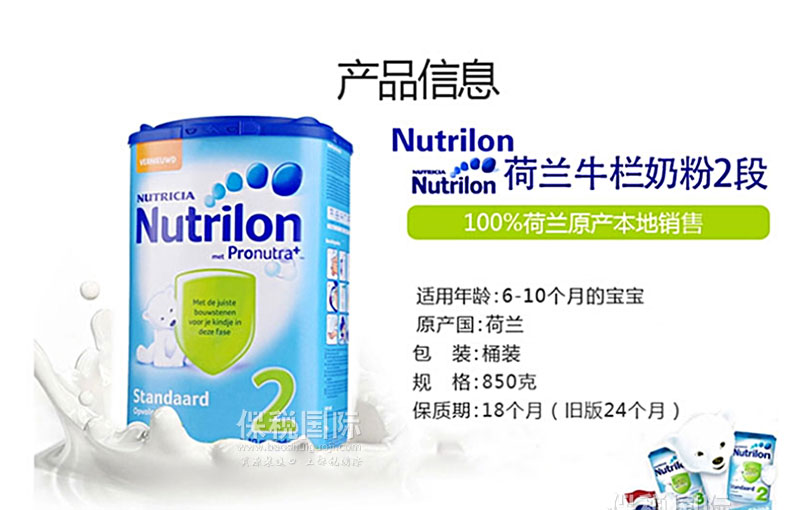 荷蘭原裝進(jìn)口正品 Nutrilon牛欄本土嬰兒奶粉2段 850g/罐 |