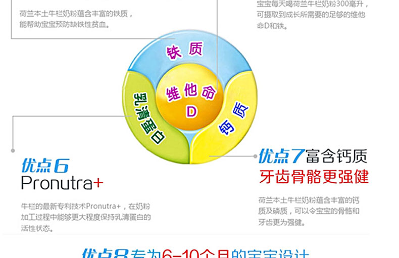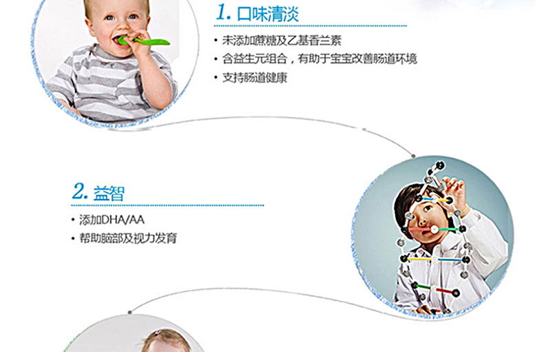 1、不含蔗糖、香精、色素、防腐劑等,降低脂肪含量,有助于寶寶身體免疫力 2、蘊(yùn)含豐富的鈣和磷,鐵質(zhì),蛋白質(zhì)和鹽,增強(qiáng)抵抗力,幫助寶寶腦部及視力的發(fā)育 3. 含有維生素A,C,D及核苷酸,有助于骨骼增長(zhǎng),增強(qiáng)免疫力 4. 添加DHA/AA,幫助腦部及視力發(fā)育,健康益智