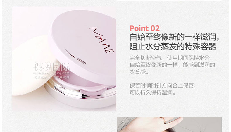 1. 含水量高達30%,滋潤光澤,是一款使用方便的粉餅型粉底霜。 2. 完全隔斷空氣,即使是使用期間也能有效保持水分,自始至終像新的一樣,能感到滋潤的水分感。 3. 改善膚色+美白+改善皺紋。 4. 真正的親近肌膚,已得到食藥廳的認證。 |
