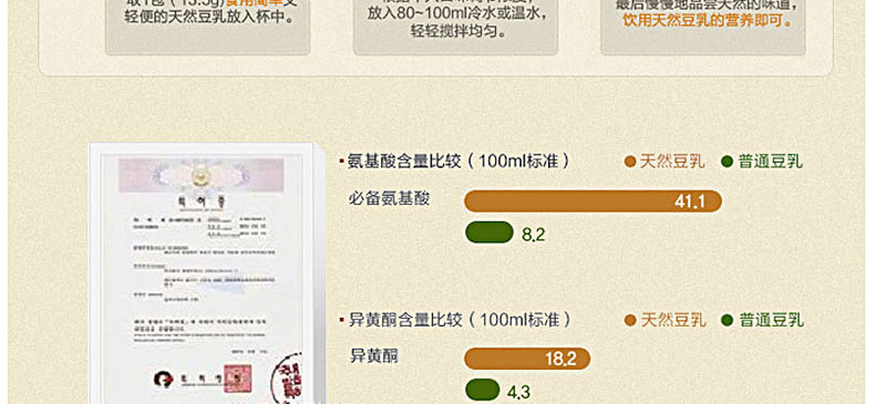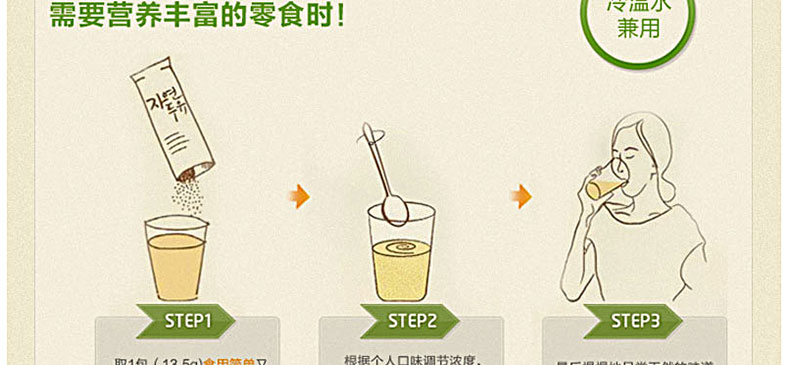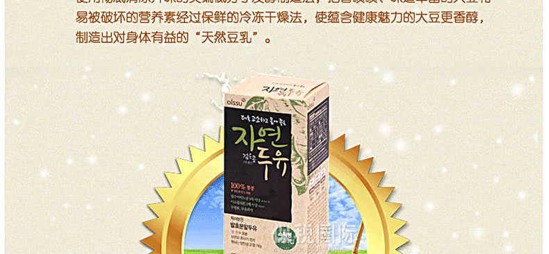 1.只采用精心挑選的100%安全又新鮮的全豆、大醬以及豆瓣醬進行科學發酵,保持健康原樣。 2.使用徹底清除異味的尖端低分子發酵制造法,把香噴噴、味道豐富的大豆和易被破壞的營養素經過保鮮的冷凍干燥法,使蘊含健康魅力的大豆更香醇,制造出對身體有益的“天然豆乳”。 |